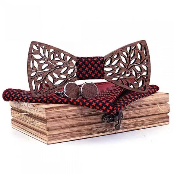 Ez az elegáns szett uraknak, mely kézzel faragott, áttört levélmintás csokornyakkendőt tartalmaz, mely kifinomult és ökologikus kiegészítője lehet bármilyen öltözéknek. A színben és díszítésben azonos dísz-zsebkendő és mandzsettagombok szépen kiegészítik az összhatást. A mandzsettagombok egyszerű, ám látványos darabok, így szép és elegáns kiegészítők. Az egész szettet rusztikus fadobozban küldjük, melyben biztonságosan tárolható, emellett különleges ajándék is lehet. Tökéletes választás olyan urak számára, akik értékelik az egyediséget és a tradicionális elemeket. Ideális kiegészítő esküvőre vagy más formális eseményre.