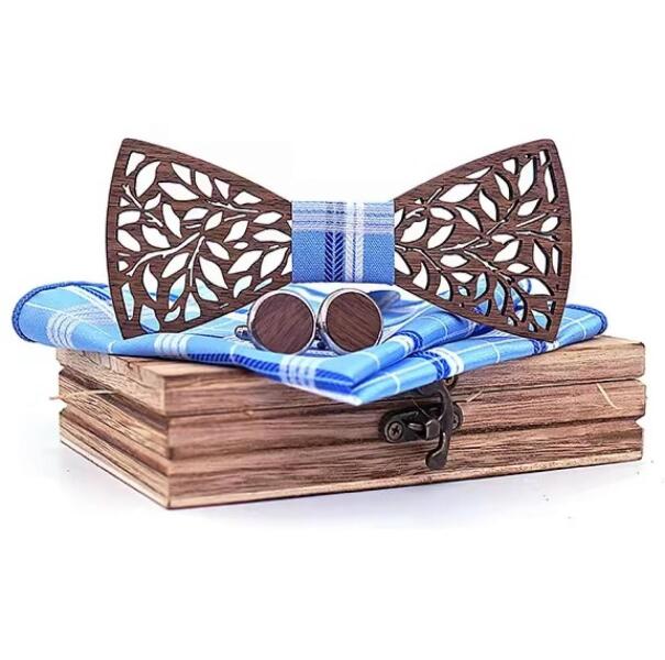 Ez az elegáns szett uraknak, mely kézzel faragott, áttört levélmintás csokornyakkendőt tartalmaz, mely kifinomult és ökologikus kiegészítője lehet bármilyen öltözéknek. A színben és díszítésben azonos dísz-zsebkendő és mandzsettagombok szépen kiegészítik az összhatást. A mandzsettagombok egyszerű, ám látványos darabok, így szép és elegáns kiegészítők. Az egész szettet rusztikus fadobozban küldjük, melyben biztonságosan tárolható, emellett különleges ajándék is lehet. Tökéletes választás olyan urak számára, akik értékelik az egyediséget és a tradicionális elemeket. Ideális kiegészítő esküvőre vagy más formális eseményre.
