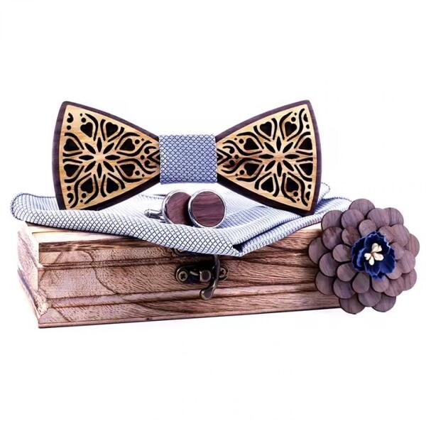 Ez a különleges szett uraknak magában kombinálja az eleganciát és az eredetiséget. A szett fából készült csokornyakkendőt tartalmaz filigrán faragással, amely finom csipkére emlékeztet, új dimenziót adva a klasszikus kiegészítőnek. A mandzsettagombok finom stílusban készültek, egyszerű kinézetűek. A szett része még egy dísz-zsebkendő is, mely kifinumolt hatást kölcsönöz. Az összhatást még egy stílusos virág alakú bross teszi tökéletessé, mely a csokornyakkendő mintájának kompozícióját tükrözi. Az egész szett egy elegáns fa dobozba csomagolt, ideális ajándékozásra. Ez a szett nem csak stílusos választás formális eseményekre, hanem a részletek iránti érzéket és a természetes anyagok iránti szeretetet is kifejezi.