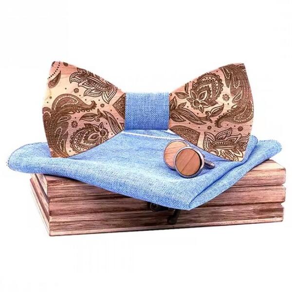 Ez a csokornyakkendőt, mandzettagombokat és díszzsebkendőt tartalmazó szett igazi gyöngyszem minden úriember számára, aki kedveli az eredetiséggel fűszerezett klasszikus stílust. A kézzel készített fa csokornyakkendőt különleges gravírozott minta díszíti, mely emeli az eleganciáját. A szettben egy pár mandzsettagomb is található melynek közepe olyan fából készült, mint a csokornyakkendő, így szépen összeillenek. A szettet egy díszzsebkendő teszi teljessé. A szett minden farabja precízen, részleteiben is szépen kidolgozott, így tökéletes ajándékötlet minden divatkedvelő úr számára. Elegáns fa dobozban küldjük, mely még fokozza a szett különlegességét.